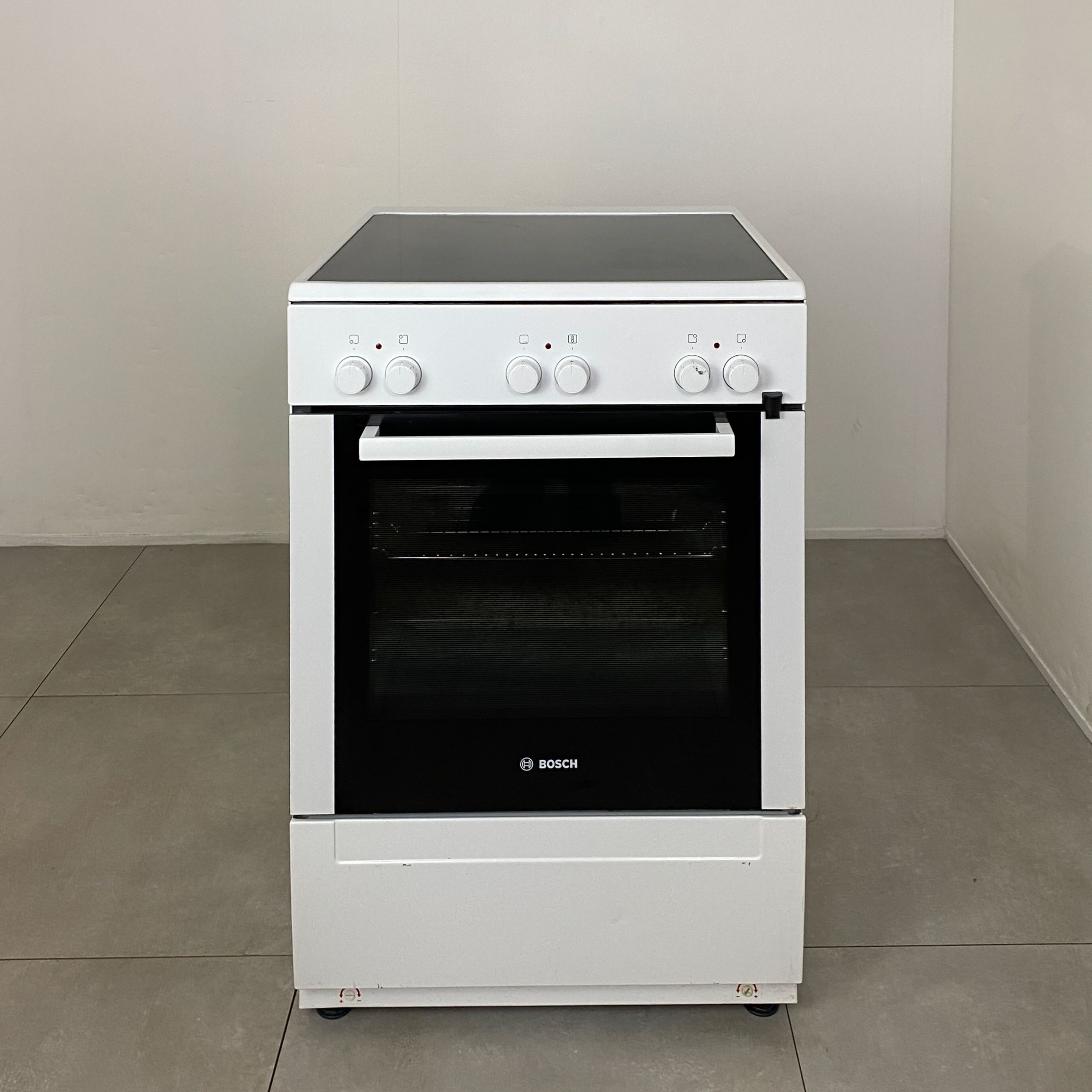 Klassisk vit spis från Bosch med glaskeramikhäll. Spisen styrs med cylindervred och hällen har fyra steglöst reglerbara HighSpeed-zoner. Ugnens nettovolym är 72 liter och insidan har GranitEmalj som är extra tålig mot repor och syror från till exempel rabarberpaj. Ugnsfunktionerna är över-/undervärme, separat undervärme, stor variogrill och liten variogrill.