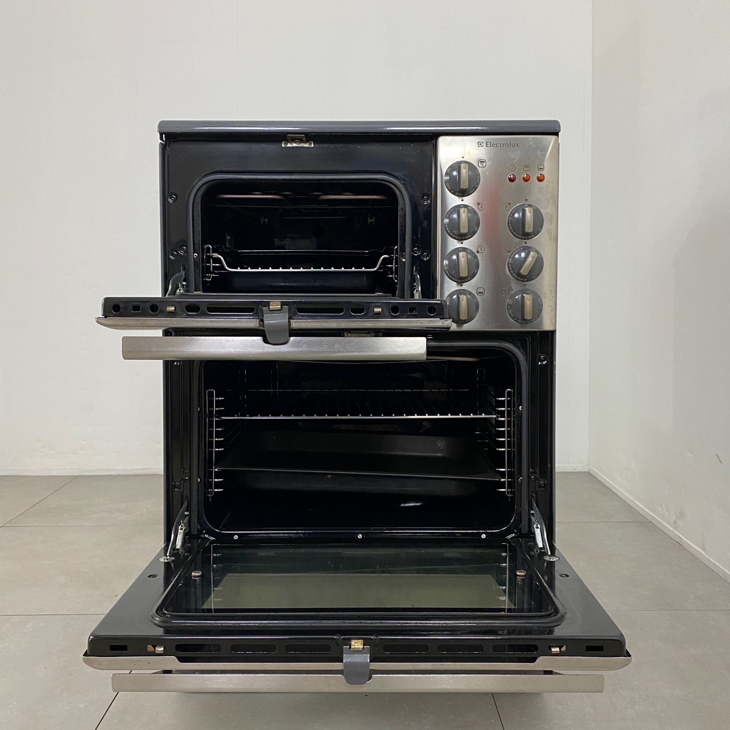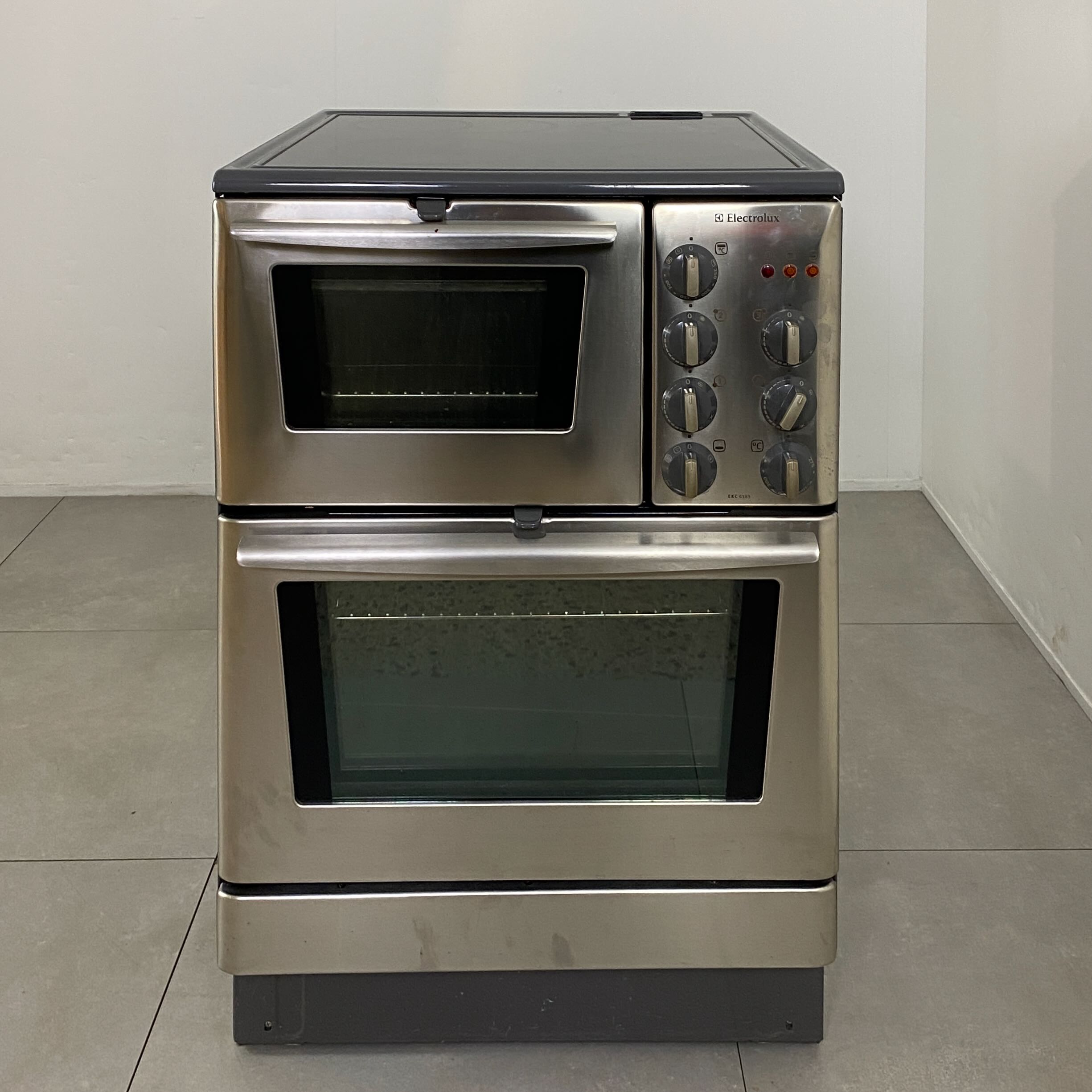 Electrolux EKC6186X är en spis med fyra glaskeramiska kokzoner och två elektriska ugnar. Den har varmluft och grillfunktion i ugnen och styrs med vred.