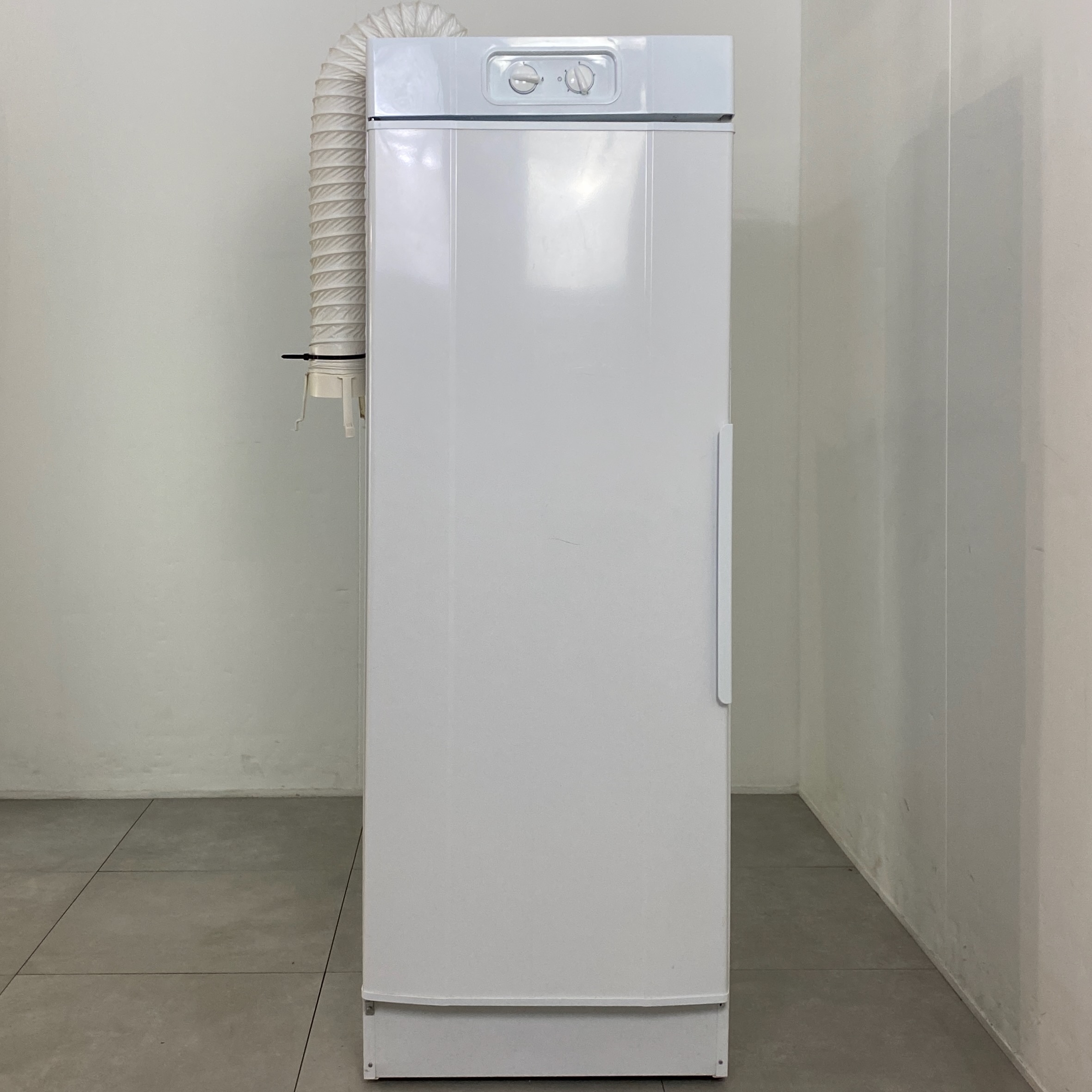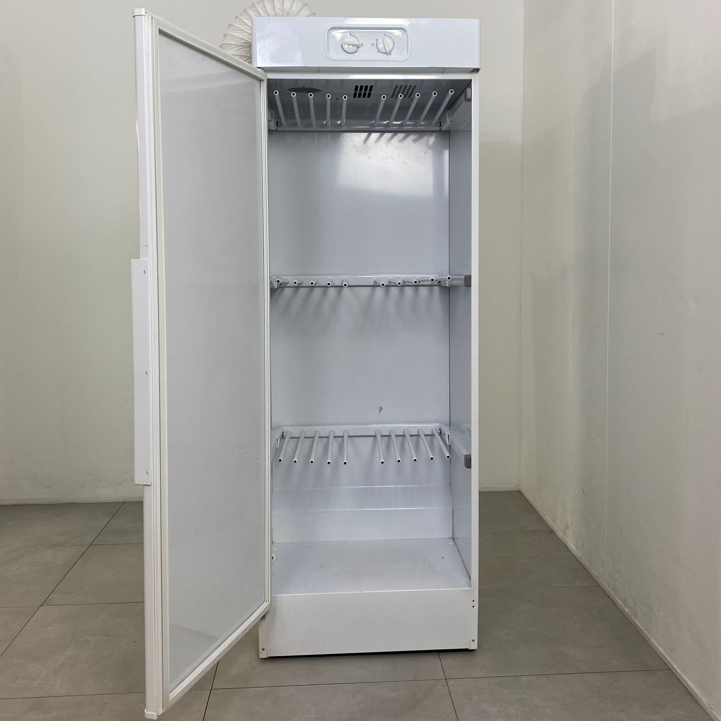Vit golvmodell med tre utdragbara och fällbar hängare och den varma, fuktiga luften leds ut via ventilationskanalen ovanför torkskåpet. Dörrens insida är dessutom utrustad med tre dörrhängare. Levereras med högerhängd dörr, vilket även går att justera i efterhand. Tidstyrd fläkt, steglös värme. 1715 × 595 × 615 mm. Hänglängd 16 meter, volym 4 kg och uppåt.